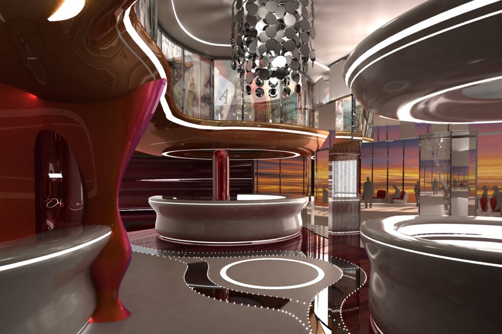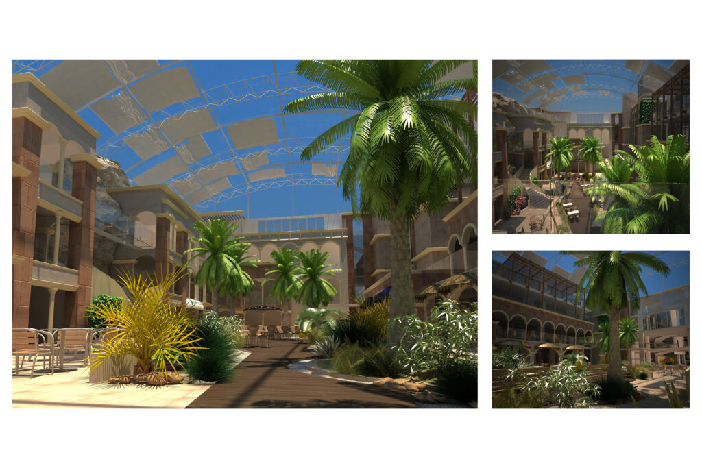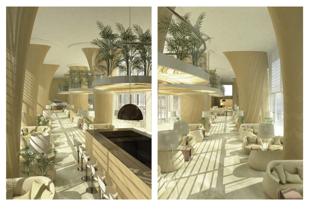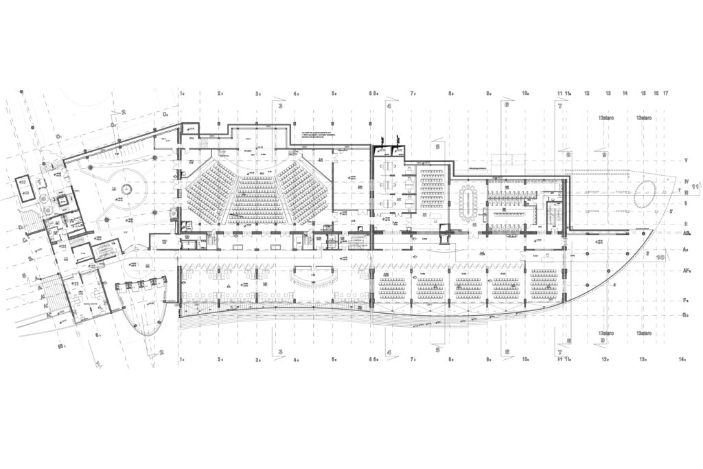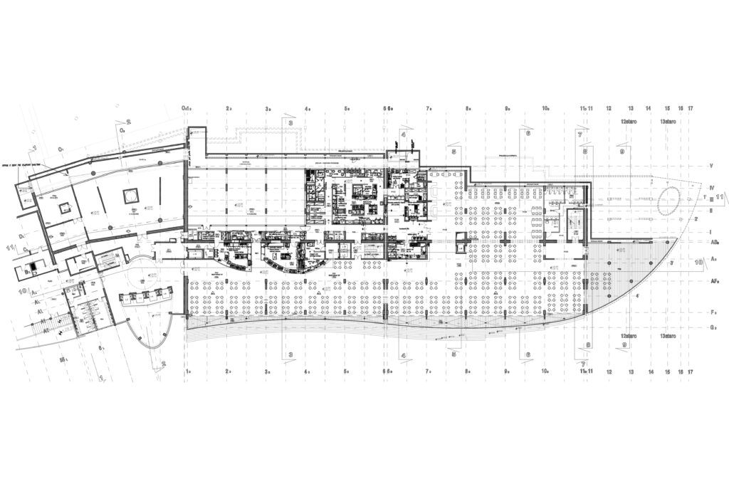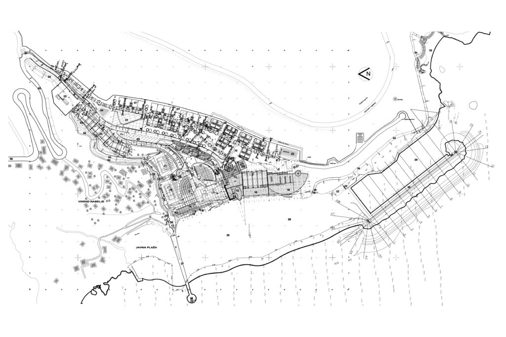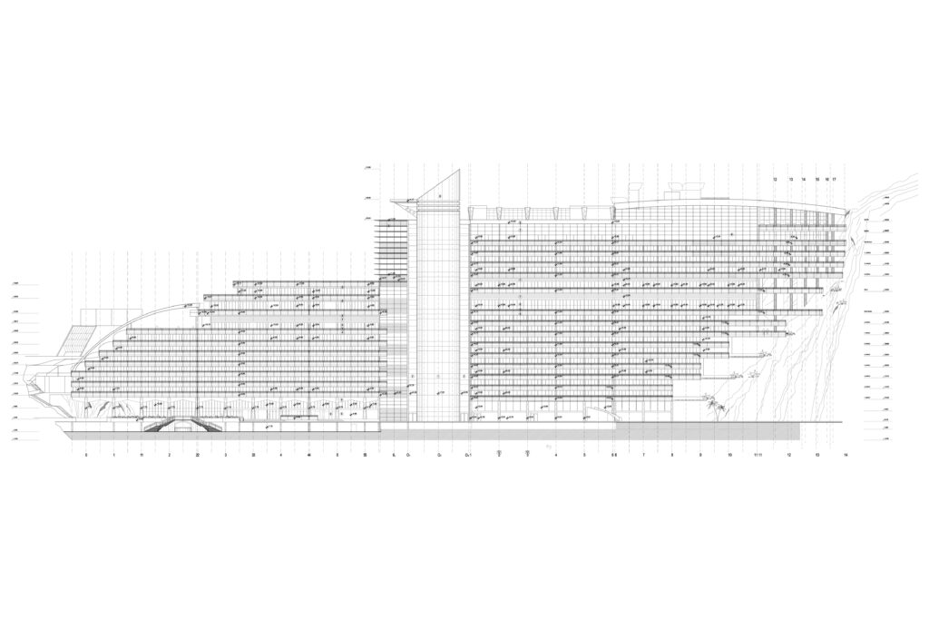 The building is carved into the rock, with a strong orientation towards the sea and an organization that follows the natural terrain configuration. The hotel has over 15 levels, with all rooms and facilities designed to offer a direct view of the Adriatic Sea. The total gross area is 80,000 m², and the hotel features 440 accommodation units. The complex includes a main restaurant, several specialized restaurants and bars, a conference center (3,100 m²), a casino, a spa center, a nightclub, as well as a private beach, a helipad on the sea, its own marina, and a pier.